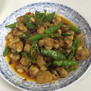 4、下青椒炒,加入老油、耗油少许,放些盐。