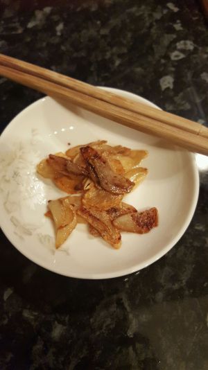 倒入葡萄酒之前把煎得金黄的蒜片夹出来备用