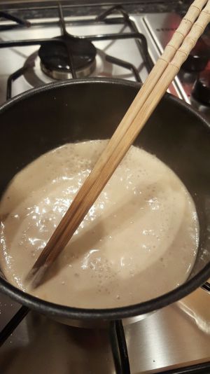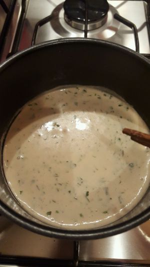把煮鸽胸肉的汤汁和淡奶油混合,可以按1:1的量加淡奶油,也可以奶油多放一些。这时候加点海盐,调至自己喜欢的咸淡