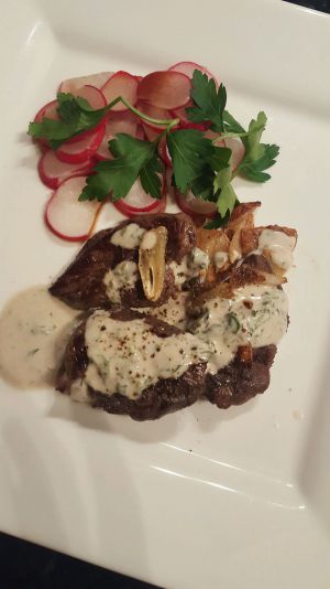可以摆盘了。把之前挑出来的蒜片也放上去。自己随便搭些沙拉。淋上调料汁。撒点现摩黑胡椒