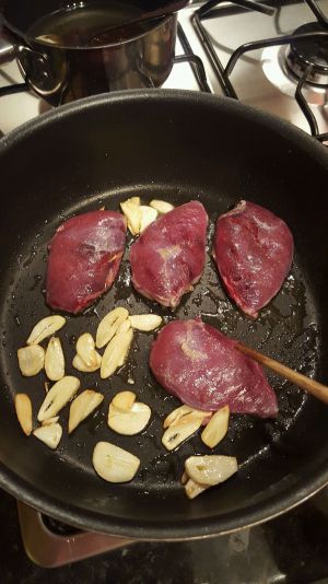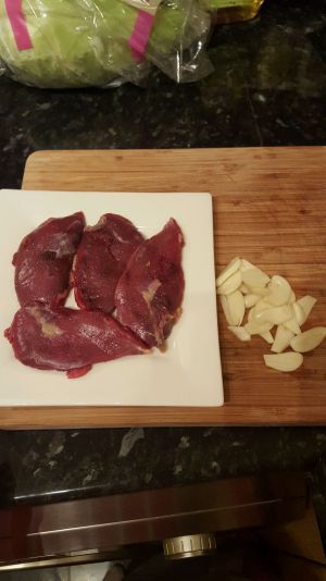 蒜瓣切片,鸽胸肉洗净后用厨房纸吸干水,两面撒点海盐。
