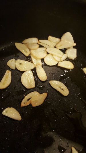 锅烧热放橄榄油,小火煎香蒜片,煎至微黄