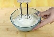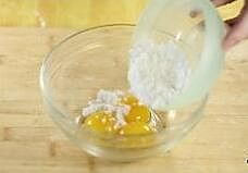 将蛋白用打蛋器打成鱼眼泡状态,然后将15g白砂糖分三次加入到蛋清中,每加一次都要搅打均匀以后再加,直到把蛋白打发成中性发泡状态(提起打蛋器,可以拉出个小尖角即可);