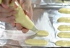 将面糊装入裱花袋,用中号圆形裱花嘴在烤盘上挤出长条形,即可放入预热好190度上下火中层烘烤10分钟即可出炉。