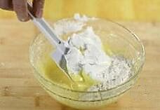 将蛋白加入到蛋黄液的碗中,用橡皮刮刀从下向上翻拌均匀;