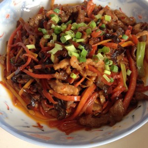 瘦肉翻炒片刻,加糖醋盐翻炒半分钟左右出锅