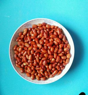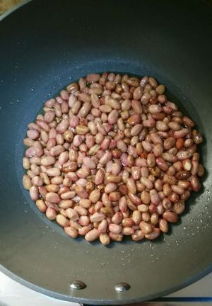 锅中加比炒菜多的油,一成热下花生米小火炸,慢慢听到噼里啪啦的声音。