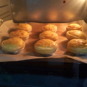这是快要烤好的蛋挞,看着鼓鼓的,冷却下来就会塌下来了(^_^)这个模样看起来是不是像酥皮汤→_→