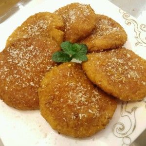 锅里倒油,下南瓜饼,油炸至两面金黄,大约两三分钟,出锅装盘
