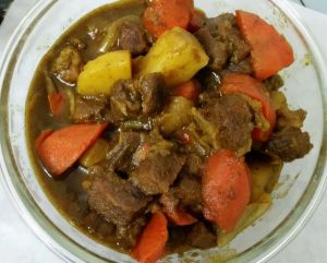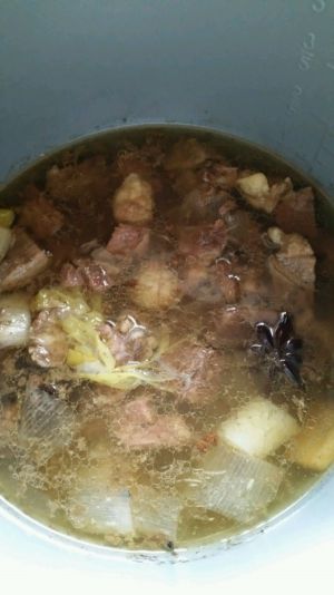 上锅烧油中小火将咖喱炒香,将肉、菜、汤及开水和调味品盐及生抽加入炖40分