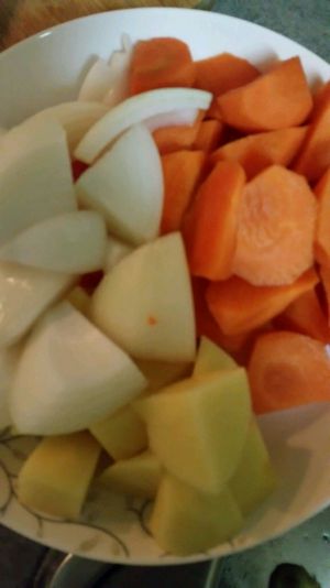 土豆胡萝卜切滚刀块,洋葱切大块备用