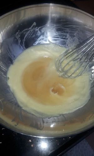 将砂糖和蛋黄加入奶酪糊中搅拌均匀。