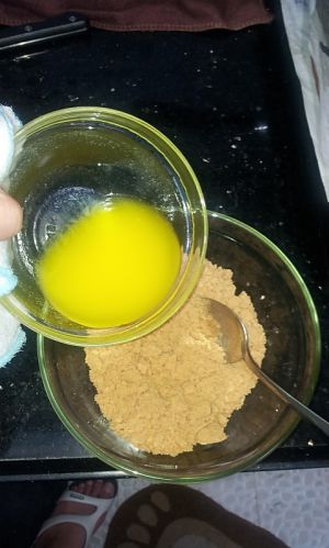 黄油液体加入饼干碎中,充分搅拌均匀。