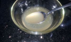 鱼胶粉放小碗中,用2汤匙热水融化开,然后加入刚刚挤出来的柠檬汁,搅拌均匀。