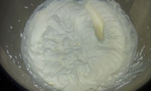 将打发好的奶油分次加入到芝士糊中,轻轻切拌均匀。