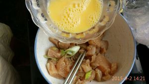 取出放入少许花生油放入一个鸡蛋搅拌均匀在次放冰箱冷藏半小时