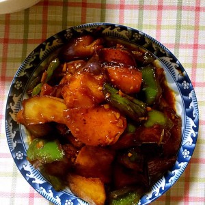 将炸好的土豆、茄子、青椒合炒.放入6g盐,5g糖和少许鸡精.