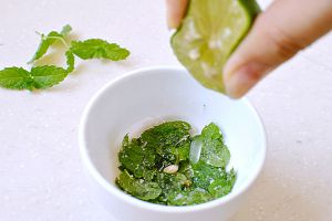 薄荷叶洗净后放入清水中浸泡一会儿,取下嫩尖,余下的部分加入白砂糖,用勺子的背面研磨至薄荷叶颜色变深出汁;