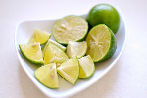 青柠洗净,一个切成八瓣柠角,另外两个对半切开;