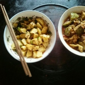 锅内留底油葱姜蒜爆香,放西红柿丁翻炒几下然后放炸好的茄子,放盐巴,翻炒,加点水与菜齐。开中火煮至收汁,切记不能粘锅。放味精翻匀,出锅右边那碗是