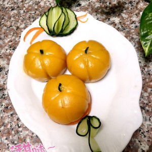 把南瓜圆中间按扁一点,再用牙签划出南瓜纹路,再用青瓜削成小尖角放南瓜中间即可