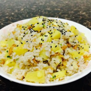 然后各个材料逐个加 最后加菠萝,最最后加葱,盐