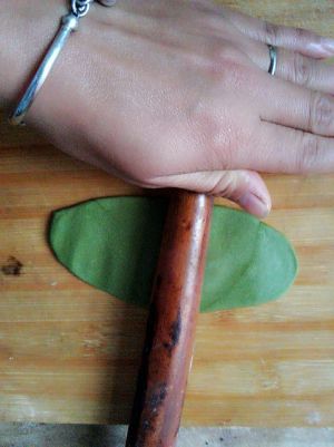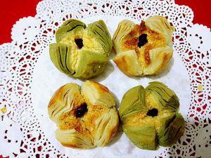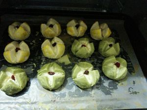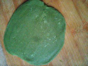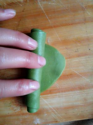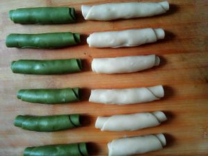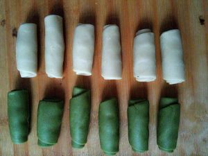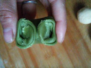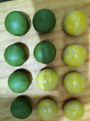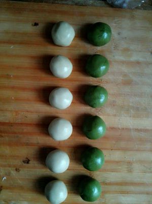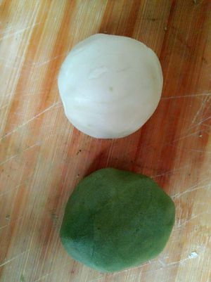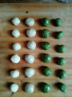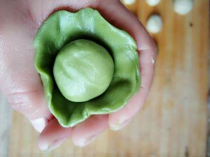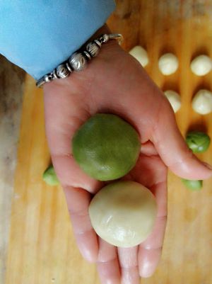 别搞混淆了,绿色的油皮包住绿色的油酥面球,白色的油皮包住白色的油酥球。
