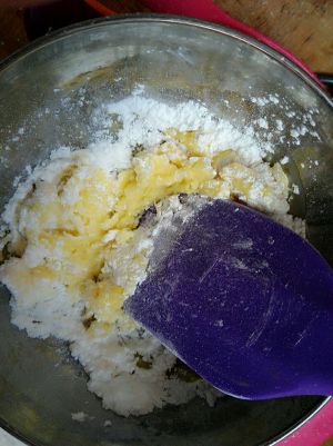 然后处理椰蓉馅,黄油软化加入糖粉搅拌均匀。(我的糖分是自己用白砂糖打的)