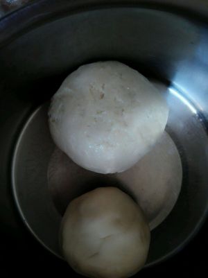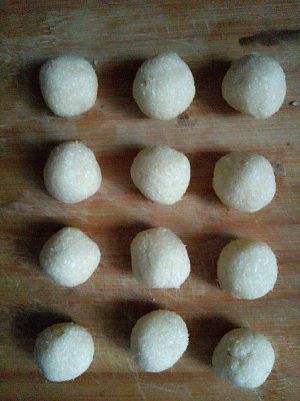 然后把压好的面卷擀成饺子皮状,放入一个椰蓉馅包起来揉成球状。