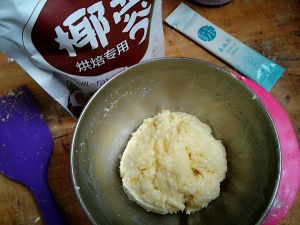 然后分两次加入鸡蛋液搅拌均匀,再加入椰蓉搅拌均匀。