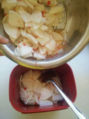 夏天我们可以放进冰箱里,味道更脆爽哟!每次都可以弄一个大萝卜,可以吃好几天