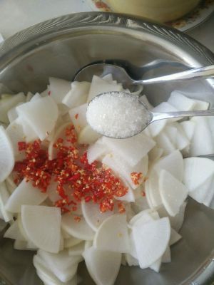 加入小米辣(不会吃辣的可以不放小米辣),适量糖、9度白醋,(盐要根据自己先前腌制水分的情况在考虑添加,这道菜主要要做成酸甜的味道)