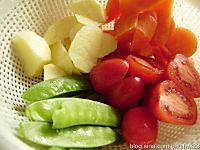 胡萝卜、土豆洗净,切滚刀块待用;小番茄洗净,对半剖开待用;荷兰豆摘去两头,撕去筋,洗净沥干待用