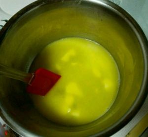 将水、黄油、糖粉、盐一起放入锅中用中火加热并稍稍搅拌,当煮至沸腾并油脂分布均匀时转小火