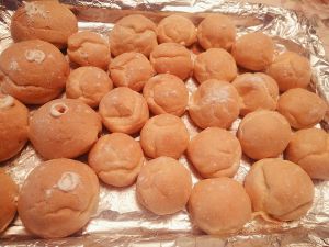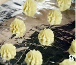 用裱花袋把面糊挤在烤盘上,将烤盘放入用180度预热好的烤箱,烤10分钟左右,当泡芙膨胀起来以后把烤箱温度调至150度继续烤20—30分钟直到表面为黄褐色。