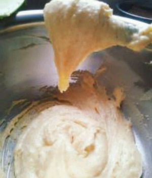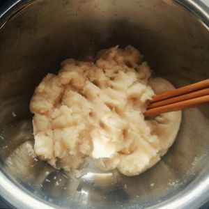 将面粉散热后,先加入少量鸡蛋液,待面粉把鸡蛋液都吸收以后再分次加入至用筷子挑起面糊,面糊呈倒三角状即可。