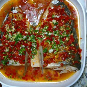 鱼头洗净对开放入盘中,在鱼头上均匀擦上盐(不需要很多,因为剁椒也跟咸),葱姜放入鱼头下,均匀喷入黄酒,在鱼头上均匀铺满剁椒