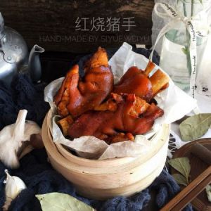 准备好食材猪手2只、葱5段、姜3片、蒜7瓣、料酒1/2汤勺、老抽1汤勺、生抽3汤勺、盐适量、香叶一片、桂皮一段、八角1瓣、冰糖30g、水适量。