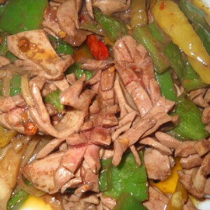 腰子切花,泡去血水。泡椒泡姜少许,青椒切块
