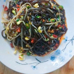 蕨根粉稍微凉一点之后捞出和豆芽放一起,放葱姜蒜,青椒红椒,老干妈,酱油,醋。