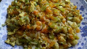 胡萝卜磨丝,豆角切丁,葱姜切末