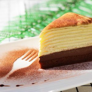 最后来组合:巧克力蛋糕慕斯底脱模,放在蛋糕转台上,盖一张千层饼皮,薄薄地刷一层咖啡巧克力汁,压上奶油霜,用抹刀以20°夹角从中心边转转台边往外压抹,直到抹成均匀且薄的一层,再盖一张饼皮,再抹奶油霜以此类推。咖啡巧克力汁可以隔一张刷一次,也可以省略。我摊了11张饼皮,奶油霜用完了还剩一张,直接吃了,嘻嘻。