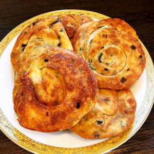 在油酥面里加入一勺盐,葱油饼是微咸的。