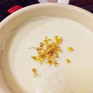 稍微晾温至可入口的温度,淋入桂花酱。桂花酱的做法是用新鲜桂花或干桂花,加入蜂蜜,密封酿制一至两周。做的时候蜂蜜建议用汪氏的洋槐蜜,口味较淡,不会抢桂花的味,本身的香气也很清新。