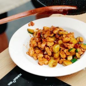 快熟时倒入炒过的鸡丁,调配好的酱汁