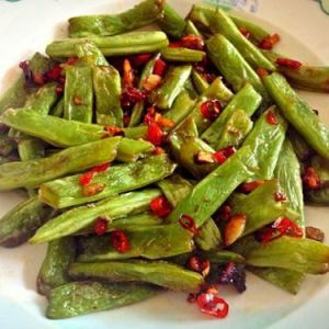 四季豆洗净,去两头,把筋撕掉,然后沥干水分,一定要干,不然炸四季豆的时候会有油溅出来的,很危险的