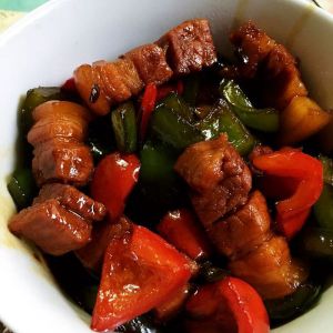 大火煮沸,然后转中火,盖锅盖,差不多要40分钟,会看到汁水浓厚了,肉也入味了,然后倒入汆烫过的青红椒