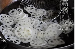 锅内坐水煮开,滚水中加入精盐、滴几滴植物油,将藕片放入锅中氽烫10秒钟,快速捞出浸入凉水冷却;