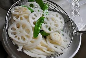 将浸凉后的藕片及荷兰豆控干水分备用;