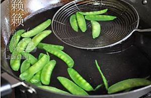 同样的方法,将荷兰豆氽烫至断生,捞出浸入凉水中快速冷却;